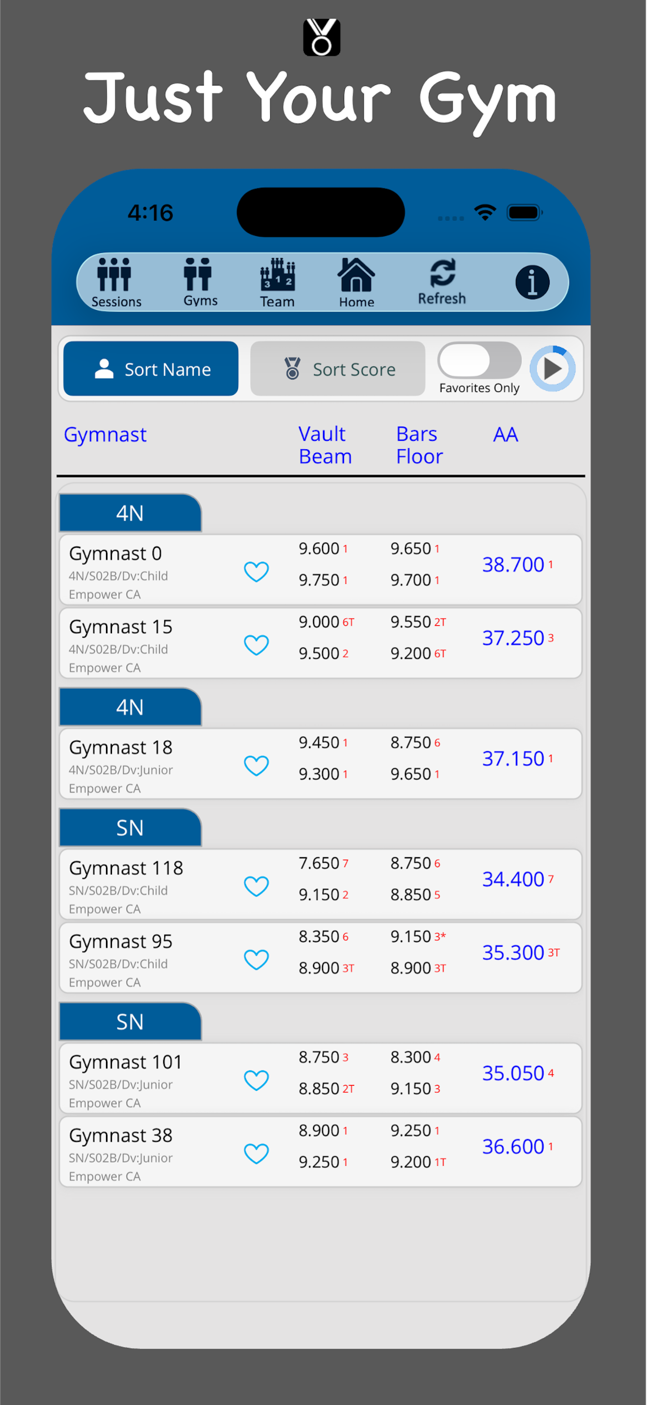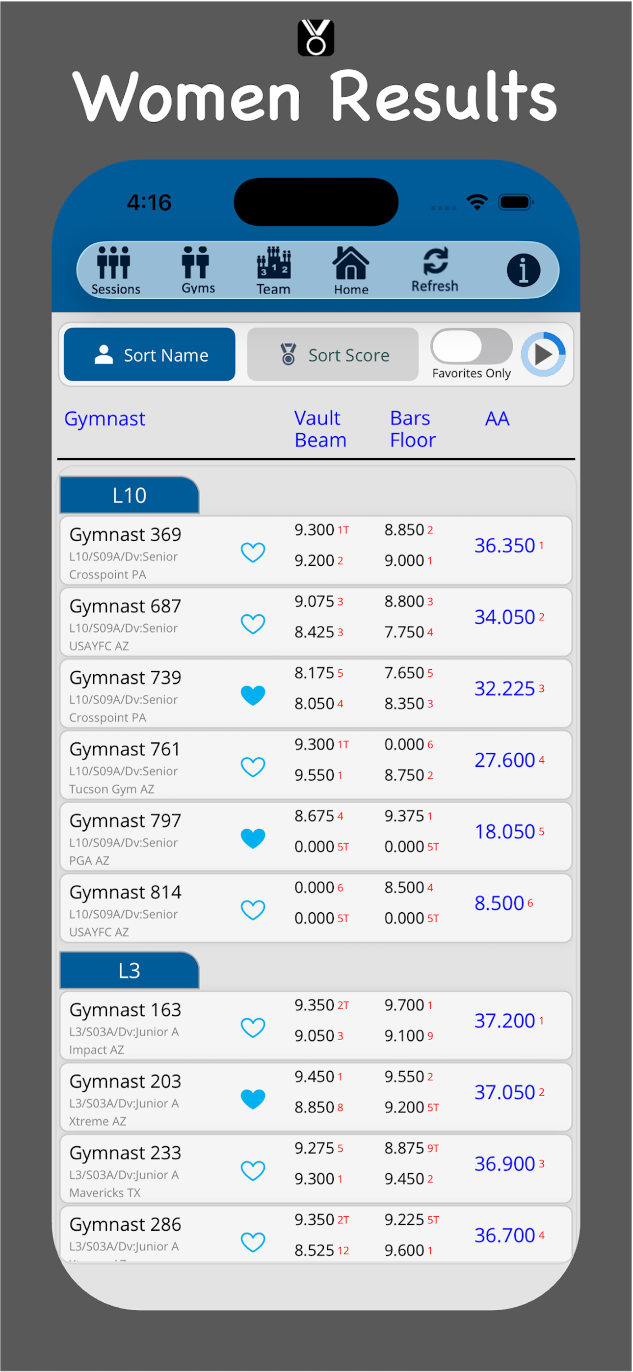 Grouped: the list is grouped by level, session, and division. This will help you see your favorite gymnast grouped with those they compete against.
